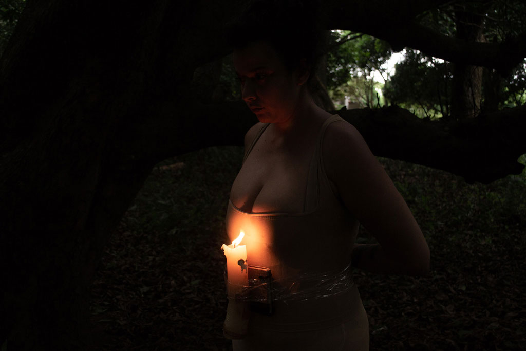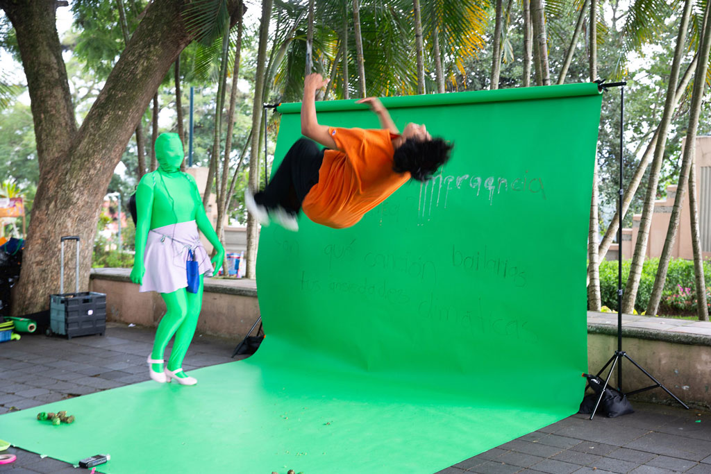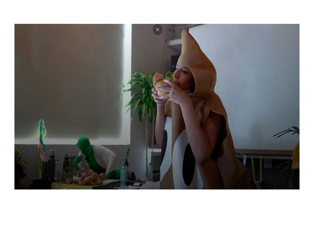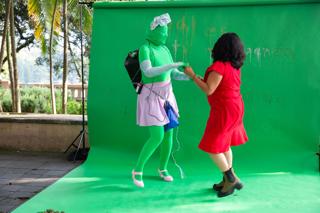 The research consists of a series of performative actions developed in the field: from speculative vocalizations and dances in clearings of disturbed forest, to a symbolic wedding with the jungle itself—a gesture of renunciation of romantic love and an opening toward broader affective bonds. In another action, a primate figure from the future invites the audience to dance cumbia as a way to think through the body about alternative modes of interspecies relating. These practices activate the body as a medium for listening and translation, expanding the field of the knowable toward the sensorial, the symbolic, and the collective.