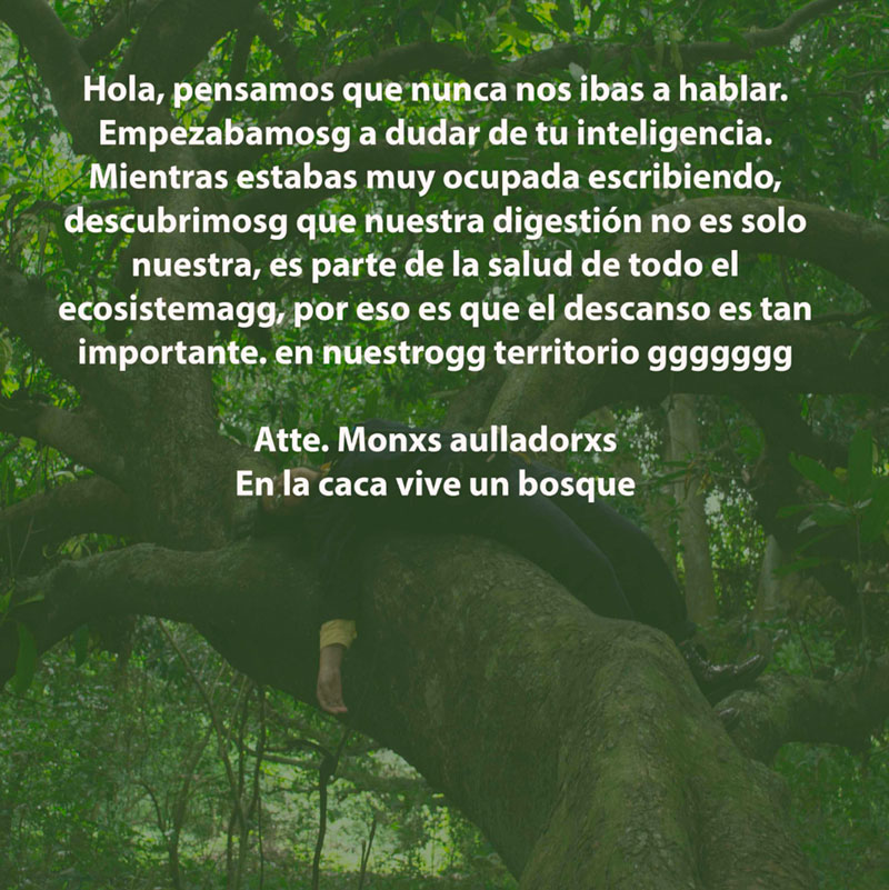 There’s a forest living in the poop, by Eréndira Gómez, shifts the scientific, objectivist gaze toward a practice of interspecies listening and collaboration that allows for the imagining of other ways of relating to the non-human. Through performative actions—vocalizations, speculative dances, symbolic rituals—the artist engages in situated encounters with howler monkeys, activating the body as a medium of translation and relational listening. These gestures point toward affective and ethical ways of coexisting, decentering the human to imagine shared futures rooted in sensorial kinship.